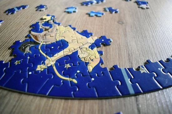 Deze bijzondere ronde puzzel toont in het midden de zon, maan en sterren, omgeven door de 12 tekens van de dierenriem. De grote puzzel voorzien van sterrenbeelden en is extra bijzonder door het glow in the dark effect waarin de hemellichamen in het donker oplichten. Een prachtig schouwspel aan de muur. De puzzel staat garant voor uren speelplezier.