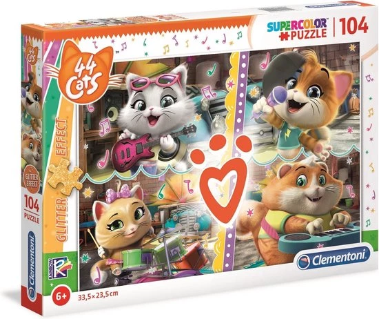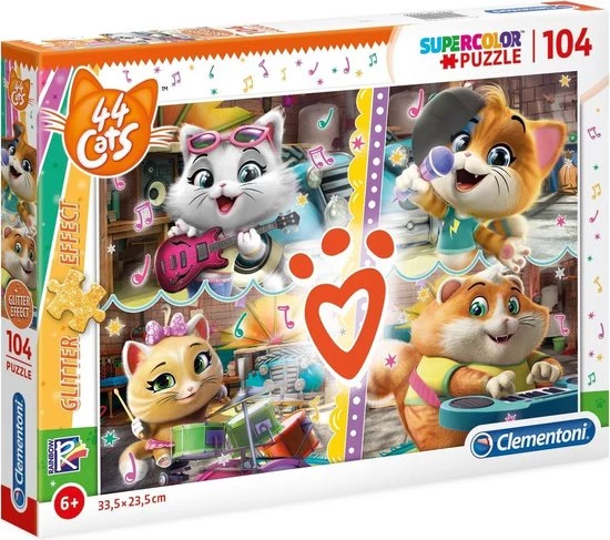 Maak samen met jouw kattenvrienden deze supermooie legpuzzel! De puzzel heeft een mooi glittereffect, wat deze rockende katten een feestelijk tintje geeft. Puzzelen is erg goed voor kinderen. Ze ontwikkelen een betere hand-oog coördinatie door te kijken naar de puzzel en het goede stukje daarin te plaatsen. Ook wordt de fijne motoriek gestimuleerd. De legpuzzel bevat 104 stukjes en is gemaakt van stevig karton. Kinderen zullen gek zijn op deze 44 Cats legpuzzel.