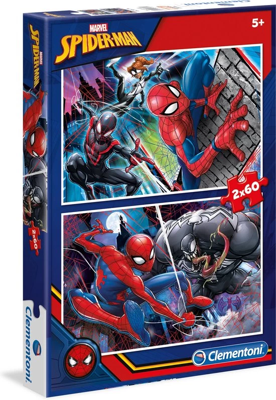 Clementoni Spider-man. Soort: Vloerpuzzel, Genre: Strips, Doelpubliek: Kinderen. Breedte: 220 mm, Diepte: 44 mm, Hoogte: 315 mm. Aantal puzzles: 60 stuk(s), Aantal puzzels met 2 stukken: 60 stuk(s)