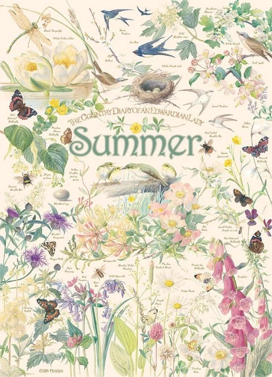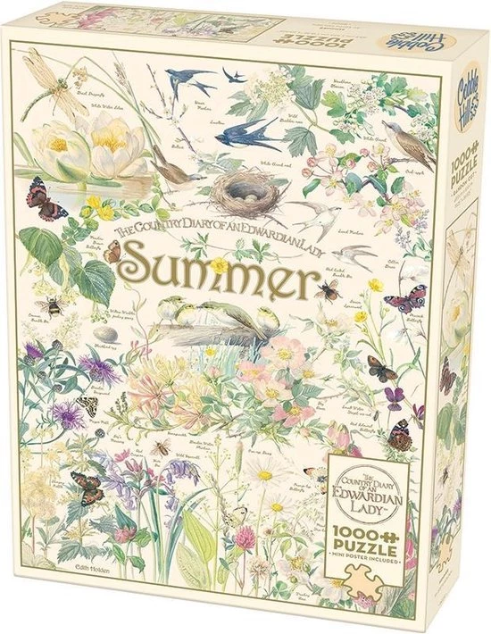 Zoemende bijen, vogels en zomer bloemen zitten in deze verticale puzzel van Cobble Hill met als thema: summer.