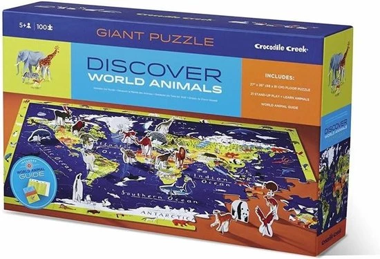 Reusachtige vloerpuzzel om de hele wereld te ontdekken! Deze puzzel leert je kleinste op een educatieve en speelse manier de wereld ontdekken. Deze vloerpuzzel bestaat uit 100 stuks en is geschikt vanaf 5 jaar. Naast de puzzel krijg je er een leuke dierenspeelset bij, bestaande uit 21 stand-up speelfiguurtjes en een spelboekje om alle dieren te zoeken op de puzzel! Leer alle continenten en hun dierenpopulatie kennen met deze leerzame puzzel van Crocodile Creek! Leeftijd: vanaf 5jaar Afmetingen: 68x91cm / puzzelstuk: 15x15cm Materiaal: alle Crocodile Creek puzzels zijn gemaakt uit gerecycleerd karton en geprint met plantaardige inkt op basis van soja. Veilig om mee te spelen en milieuvriendelijk! Het Amerikaanse merk Crocodile Creek maakt uniek kwalitatief speelgoed en leuke kleurrijke produceten voor kinderen. Puzzels, ballen, brooddozen,…