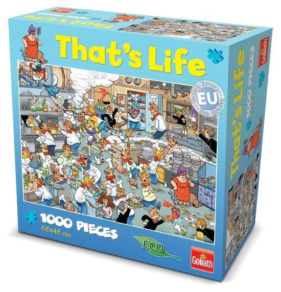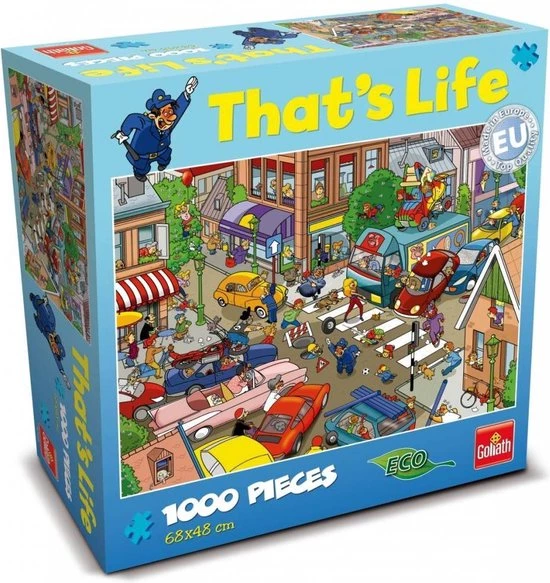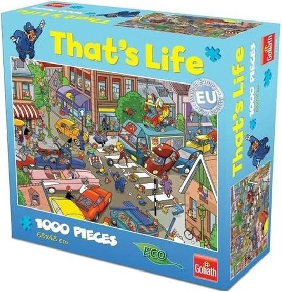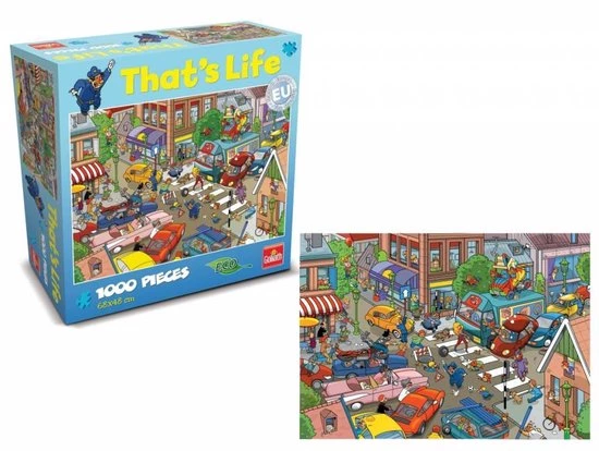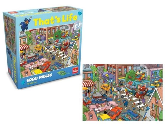 That’s Life Puzzels: Leuke, chaotische puzzels, midden uit het leven! De That’s Life puzzel serie bestaat uit zes verschillende thema’s, deze puzzel heeft als thema Village. De puzzel bestaat uit 1000 stukjes, heeft een afmeting van 48×68 cm en is van hoge kwaliteit!
