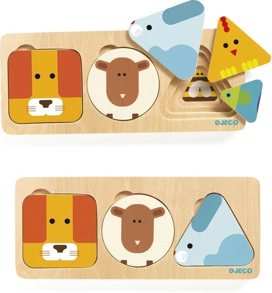 Deze houten puzzel Anima Basic van Djeco bestaat uit 3 puzzels die elk uit 3 lagen/stukjes bestaan. Elk puzzelstuk heeft een andere vorm waarbij er telkens achter elk puzzelstukje een lief dierenvriendje schuilt. Een perfect kado voor de eerste verjaardag. Ideaal voor de ontwikkeling van de motoriek.