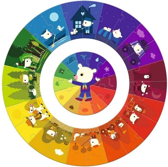 grote ronde puzzel van 24 puzzelstukken in het thema kleuren van Djeco. In het midden maak je ook nog eens een kleine puzzel van 13 stukken.
