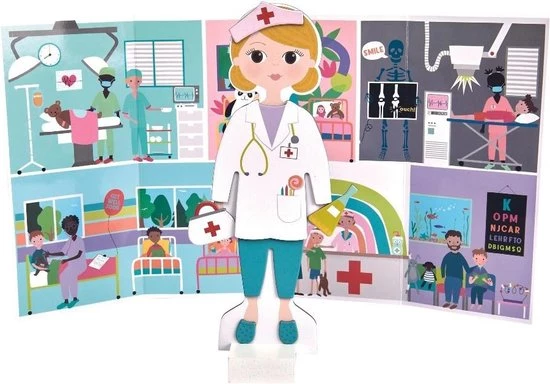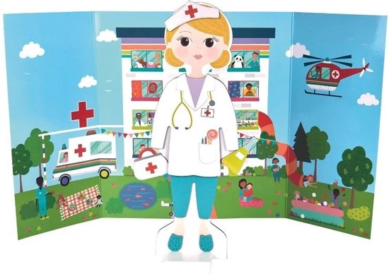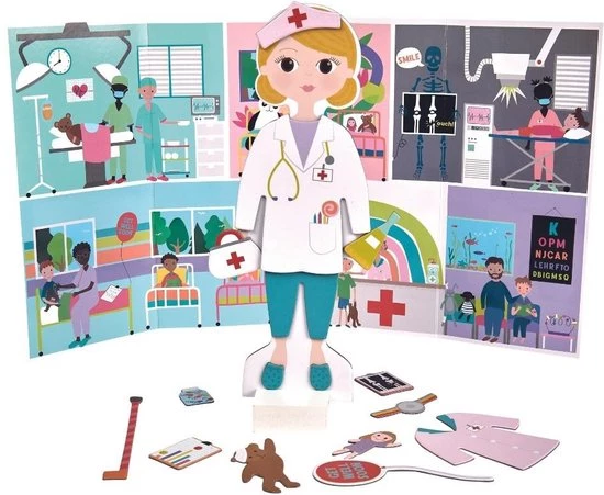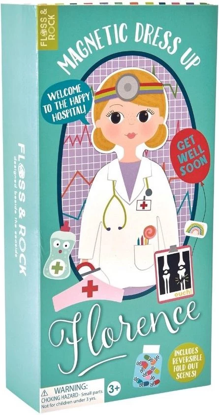 Floss & Rock Magnetische Dress up pop, Florence. Deze magnetische, houten aankleedpop Florence kan je in maar liefst 6 verschillende personages aankleden. Allemaal in ziekenhuis-thema. De ene dag is ze een arts, de andere een verpleegster of een patiënt. Jij beslist! Mix & Match en plaats haar in de juiste sfeer door een achtergrond scène te kiezen passend bij haar outfit! Een fantastisch cadeau voor elke arts of verpleegster in de dop of voor iedereen die van verkleden houdt. Leuk om te geven voor een verjaardag of de feestdagen.
