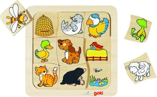 Wie leeft waar? Leerzaam houten legspel voor peuters om te leren waar de dieren leven. Het spel is van hout gemaakt en is 9-delig.