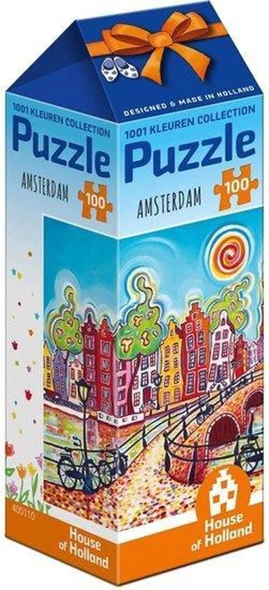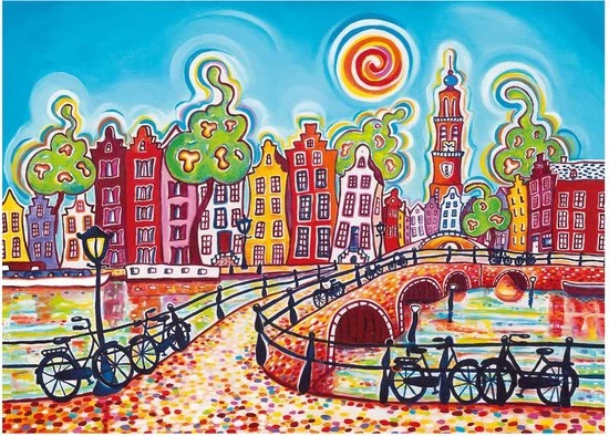 Deze kleurrijke puzzel van Amsterdam is gebaseerd op een schilderij van kunstenares Eveline Bouwkamp. Haar typische Nederlandse landschappen en stadsgezichten zijn altijd op een vrolijke manier geschilderd. Geen wonder dat haar atelier “1001 kleuren” heet.