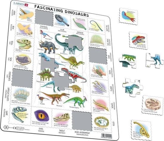Met Larsen leer je de wereld kennen terwijl je aan het puzzelen bent. Leg de puzzel en ontdek de speciale kenmerken van beroemde soorten dinosaurussen. Zo leer je allerlei nieuwe dingen over jouw favoriete dieren! De stukjes leg je op een puzzelplaat, waardoor je jouw creatie makkelijk verplaatst of inlijst.