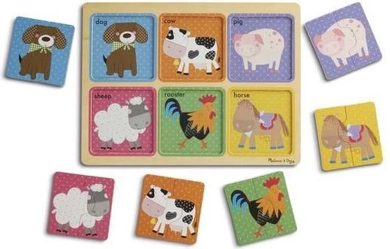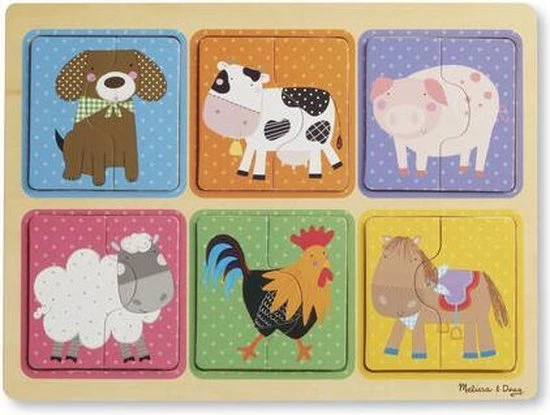 Zes puzzels van 2 stukjes. Voor kinderen vanaf 2 jaar. Thema Boerderij dieren