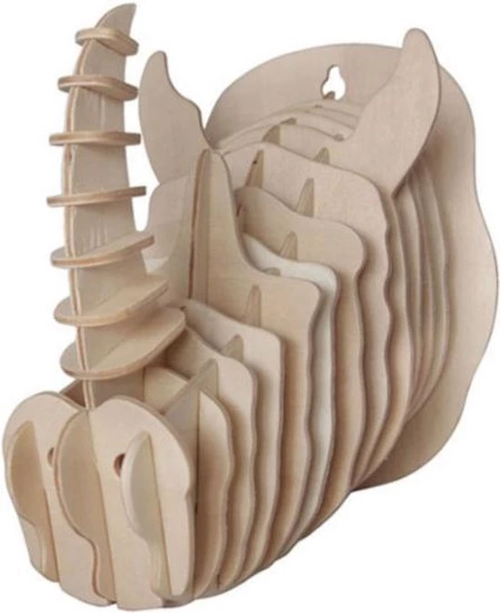 Houten bouwpakket / 3D Puzzel van een hoofd van een neushoorn. Leuk voor aan de muur. Mooi bouwpakket, educatief en leuk om te maken. Geen lijm nodig bij de montage, de onderdelen kun je netjes in elkaar schuiven. Geschikt voor alle leeftijden vanaf 7 jaar.