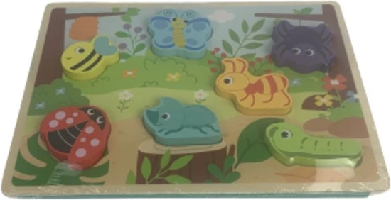 Houten noppenpuzzel met 7 puzzelstukken van dieren, geschikt voor de leeftijd vanaf 1 jaar.