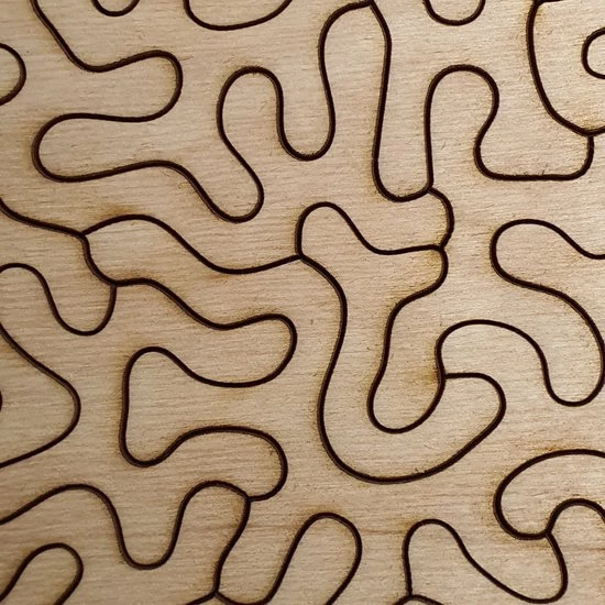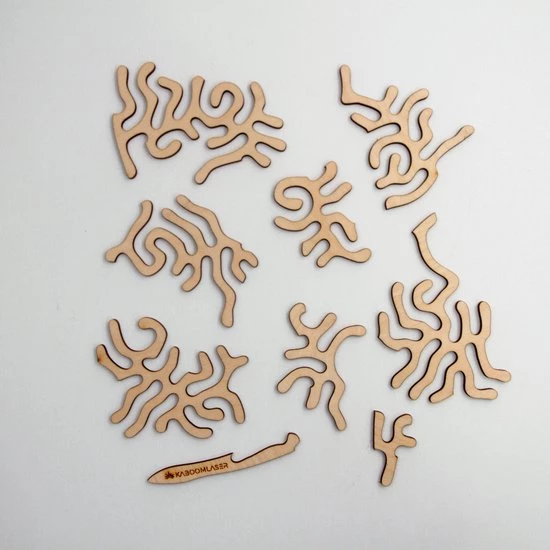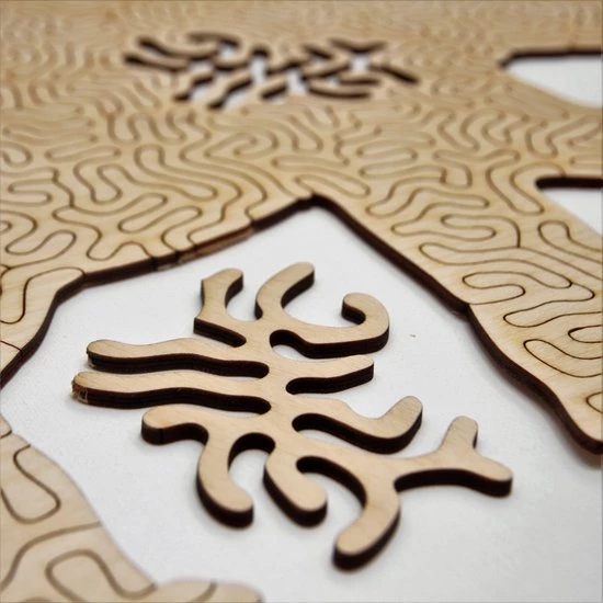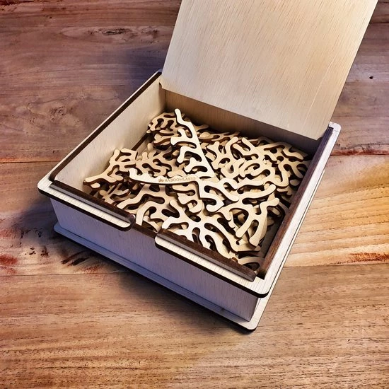 De houten puzzels uit Entropy serie hebben robuuste stukjes met grillige vormen, mooie lijnen en zachte krommingen. De puzzels zijn ontworpen met onze eigen software, die nabootst hoe patronen in de natuur ontstaan. Hierdoor krijg je puzzelstukjes met natuurlijk ogende vormen. De Entropy puzzels zijn complex en uitdagend maar toch kan je ze in een paar uur maken. Ze zijn ook erg leuk om in gezelschap te doen. Omdat deze puzzels geen afbeelding hebben, maak je ze door de juiste vormen bij elkaar te zoeken. Begin met de meest opvallende vormen: bijvoorbeeld een ‘haak’, een ‘voet met knie’. je zult zien dat je de eerste stukjes al vrij snel bij elkaar kunt vinden.