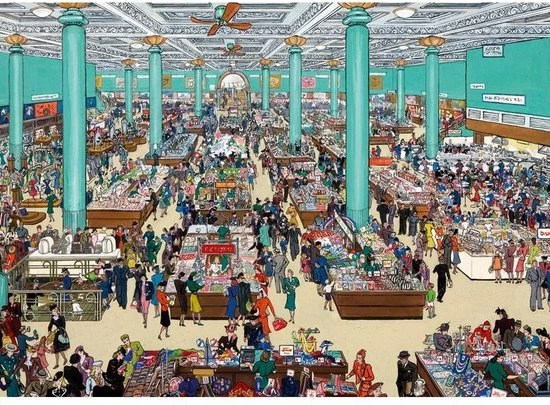 GibsonsPuzzel The January Sales – 2 x 1000 stukjesDeze prachtige puzzels van Gibsons zijn gemaakt van 100% gerecycleerd puzzelbord, het dikste karton op de markt.De afbeeldingen zijn getekend door Grace Golden.De eerste puzzel heeft een afbeelding van een typisch grootwarenhuis tijdens de solden. De tweede afbeelding is een drukke Britsche winkelstraat.Afmetingen: elke puzzel 486mm x 680mm Veiligheid: deze puzzel voldoet aan de internationale veiligheidsnormen voor speelgoed (met name EN71)Waarschuwing! Niet geschikt voor kinderen onder de 2 jaar.