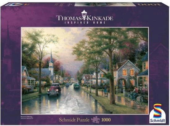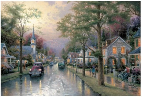 Weer zo’n prachtige puzzel van Thomas Kinkade. Dit maal van een typisch Amerikaans dorp uit de jaren 60. Prachtig weergegeven in een schemerige regenachtige sfeer. Puzzel bevat 1000 stukjes, leeftijd vanaf 12 jaar.