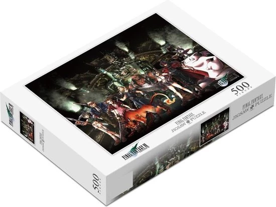 Featuring the classic character illustrations by Tetsuya Nomura from Final Fantasy VII with iconic depictions of Cloud Strife, Tifa Lockhart, Aerith Gainsborough, Barret Wallace, Yuffie Kisaragi, Vincent Valentine, Cait Sith, Cid Highwind and Red XIII in front of Midgar’s Mako Generators.