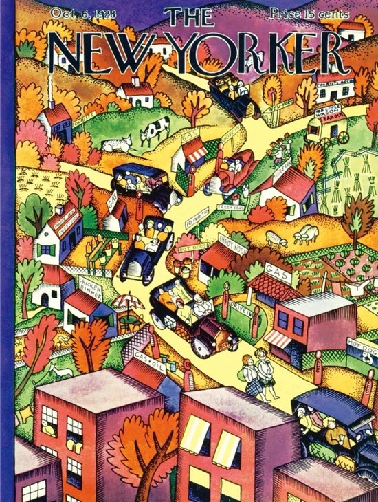 De omslagen van de New Yorker hebben de lezers van het tijdschrift bijna een eeuw lang vermaakt. Met ongeëvenaarde visuele verfijning en humor laten ze geen enkel onderwerp aan zich voorbij gaan. Een reeks buitengewone kunstenaars blijft onuitwisbare beelden creëren die oneindig gevarieerd zijn in stijl en toon, of het nu grillig, provocerend, sereen of grappig is. Deze New Yorker cover is ontworpen door kunstenaar Ilonka Karasz, gepubliceerd in 1928.