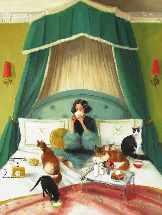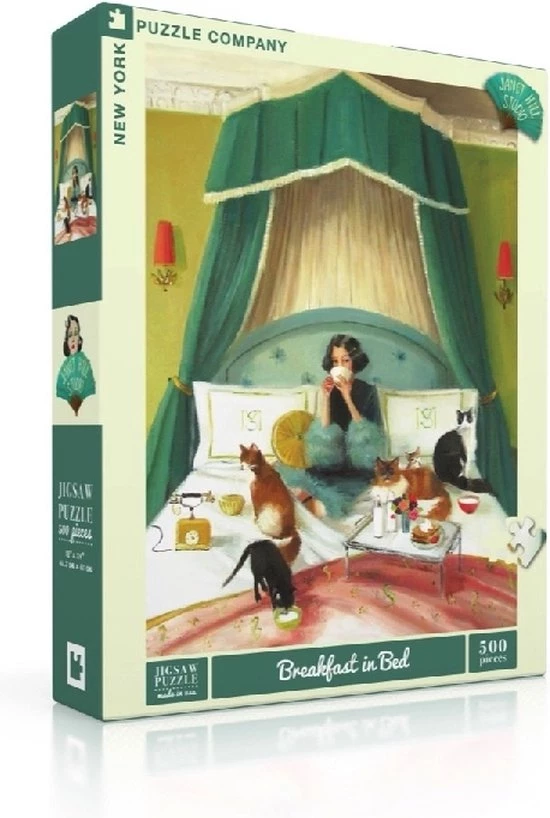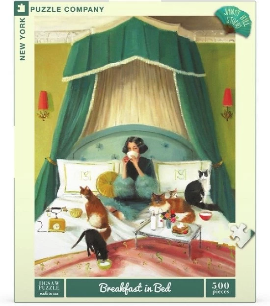 Sommige ochtenden zijn bedoeld om in bed door te brengen. Dan kun je daarna heerlijk ontspannen door deze schilderachtige puzzel van New York Puzzle Company te leggen. Wanneer je de puzzel af hebt, zie je hoe een jonge vrouw en haar kattenvriendjes ontbijten in een luxueus bed. De puzzel heeft 500 stukjes en heeft een linnen stijl afwerking zodat de puzzel minder glimt. Aanbevolen leeftijd: 10+ jaar.