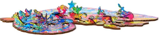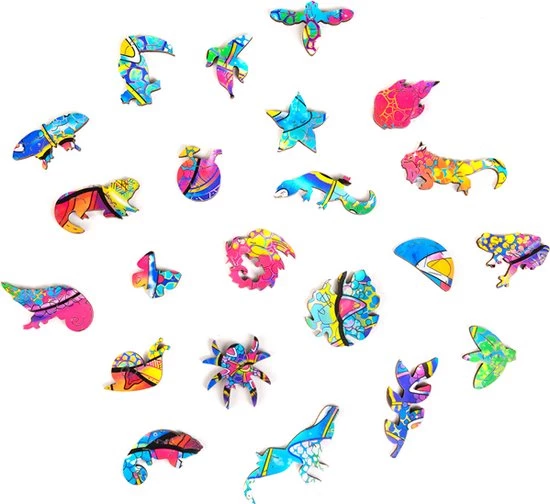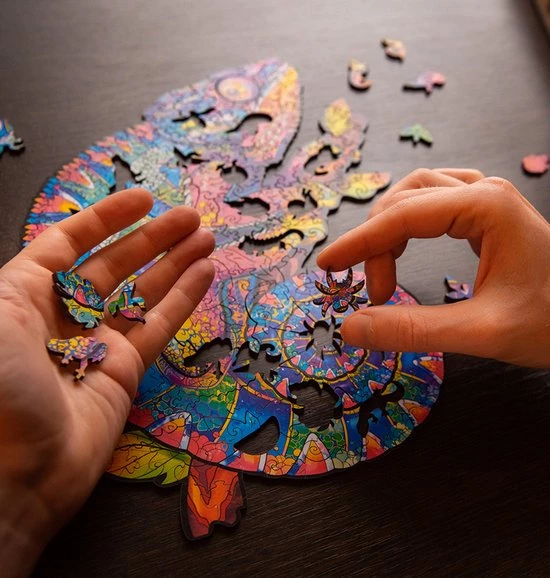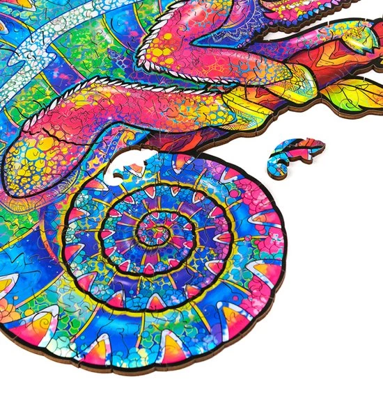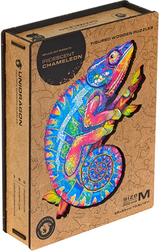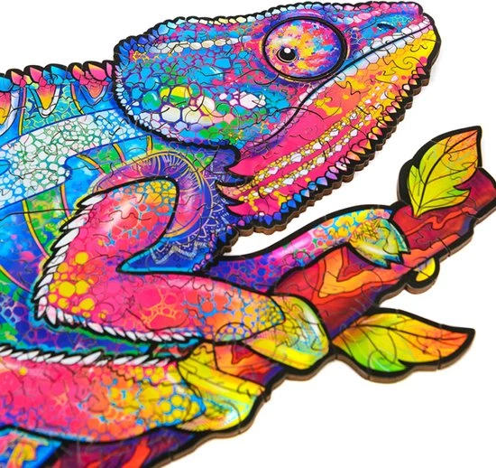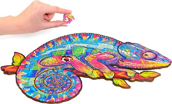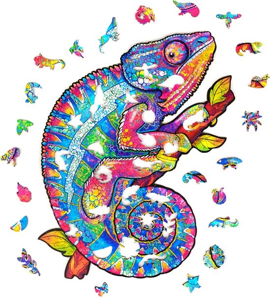 Deze geweldige hagedis weet hoe hij zichzelf alle kleuren van de regenboog moet geven. Hij heeft de meest prachtige ogen van de planeet. Ze zien alles om hem heen, en valt kleine insecten aan met de snelheid van het licht. Regenboog Kameleon. Onze puzzel zorgt ook dat je jouw ogen uit kijkt. Deze meester van de vermomming zal je heel veel nieuwe en interessante dingen leren over zijn leven: over exotische hagedissen en vogels, over palmbomen in de zon, over sappig fruit en zijn favoriete lekkernij – insecten. De puzzelstukjes zijn gemaakt van berkenhout multiplex dat een fijne natuurlijke aroma heeft die je helemaal in de jungle sfeer bent. De vorm van de puzzelstukjes is in alle sets anders. Dit is geen uitzondering.