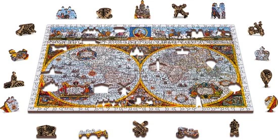 De puzzel toont een antieke kaart in kleur van cartograaf Blaeu. Met impressies op de randen naast de hemisferen.